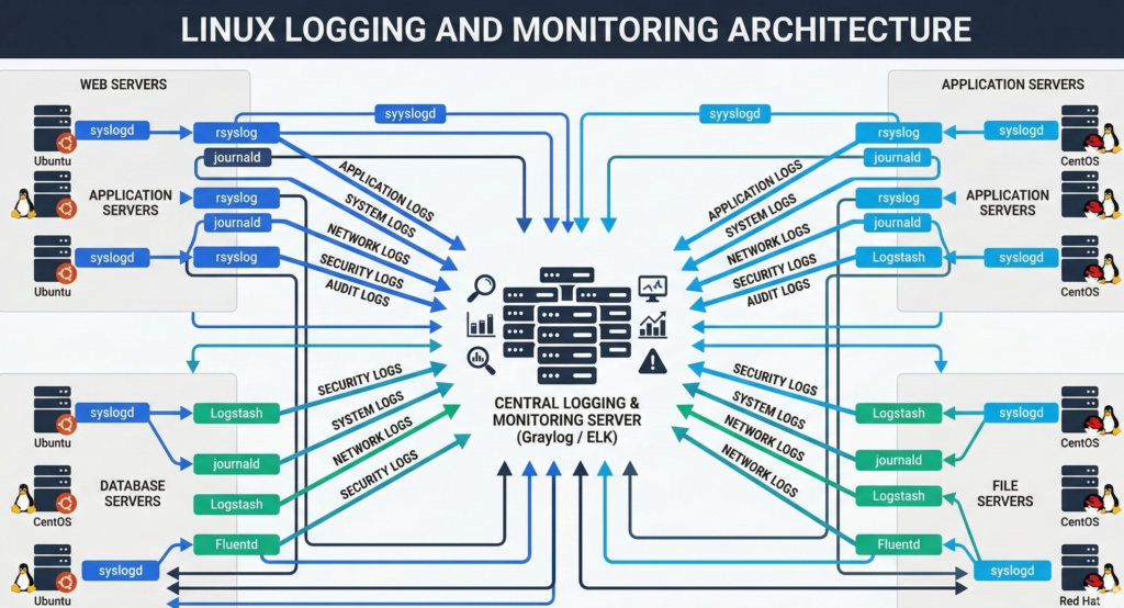 Linux systems include built-in logging frameworks such as **systemd logging tools and centralized logging pipelines.