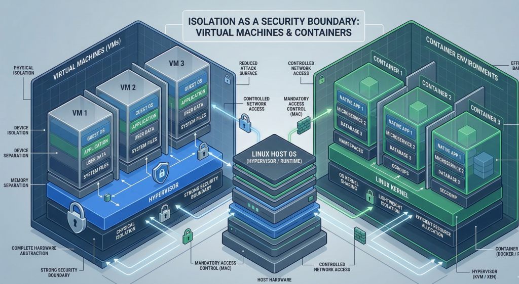 Isolation prevents compromised processes from affecting other systems. Technologies such as virtual machines, containers, and sandboxed environments allow risky workloads to run separately from critical systems, limiting the impact of malware or exploitation attempts.