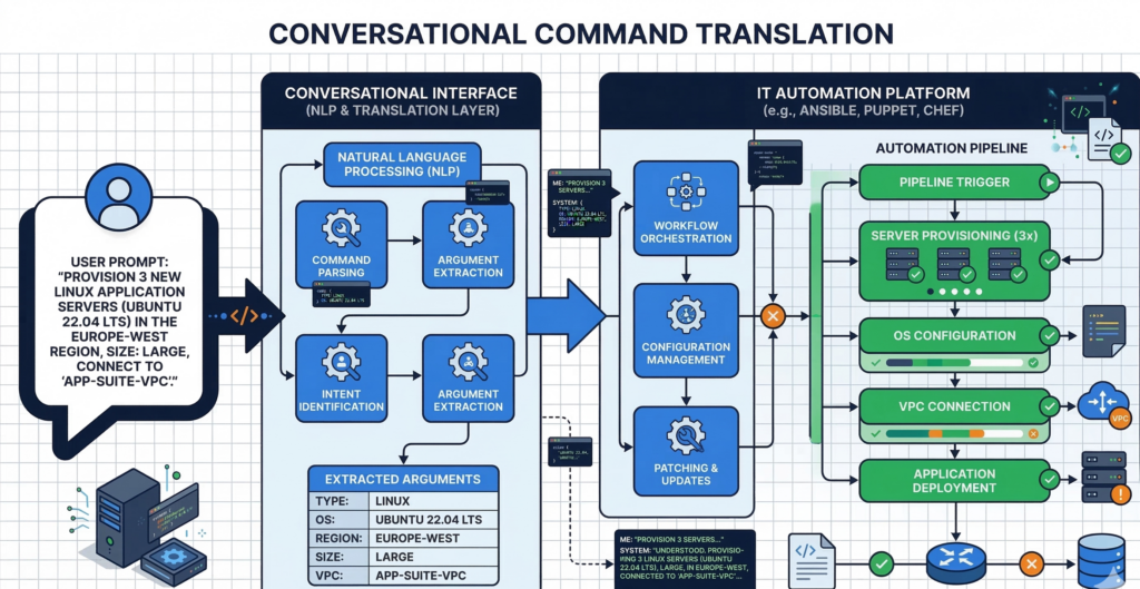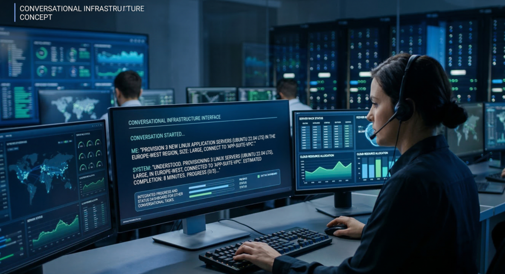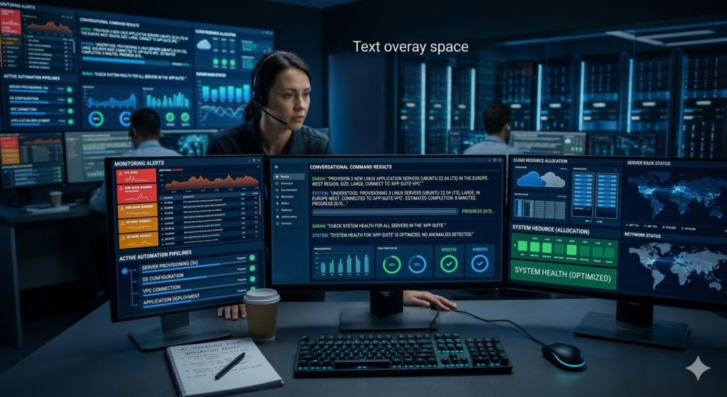 Instead of running scripts manually, administrators interact with infrastructure through natural language commands.